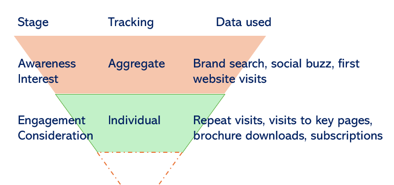 For the early stages – awareness, interest – many journeys cannot be digitally tracked due to identity gaps and offline steps, so progression of customer cohorts from one stage to the next over time is done by mathematical modelling.