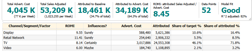 Other useful outputs include diminishing returns charts, channel contributions, ROMI over time.
